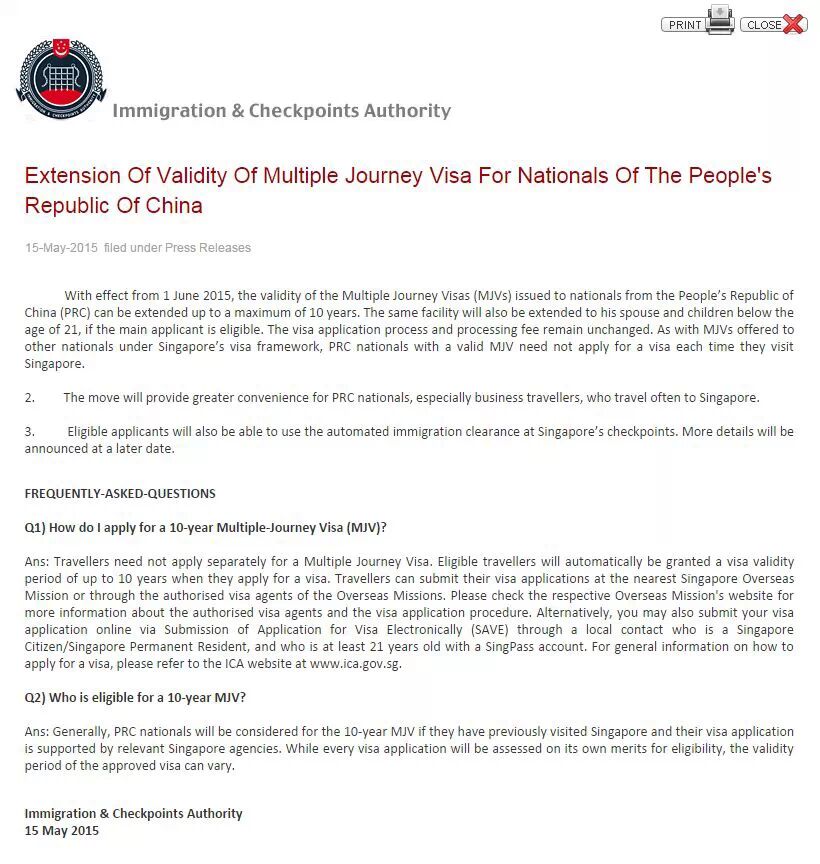今日新加坡移民局网站发布消息,新加坡将于6月起对华实施10年多次签证。签证时间和费用不变。届时新加坡将成为继美国和加拿大后第三个对华开放10年签证的国家。